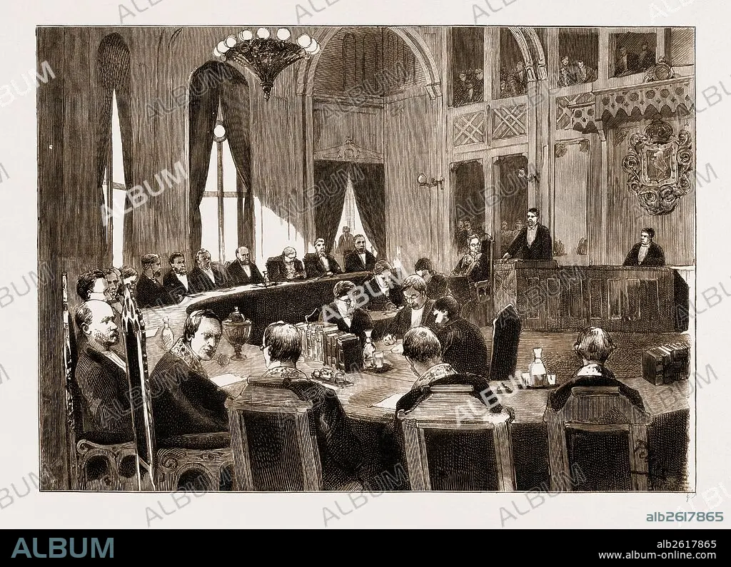 Caption: THE CONSTITUTIONAL CRISIS IN NORWAY, 1883: VIEW OF THE COURT AT CHRISTIANA IN WHICH THE NORWEGIAN MINISTRY IS BEING IMPEACHED, Official Reporters and Secretaries, Judges of the High Court of Justice, Mr. Lange, President of the Court
