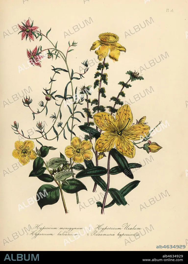 Caption: Chinese St. John's wort, Hypericum monogynum, Nepal St. John's wort, Hypericum uralum, Majorca St. John's wort, Hypericum baleericum, and Hypericum-like reaumuria, Reaumuria alternifolia Reaumuria hypericoides. Handfinished chromolithograph by Noel Humphreys after an illustration by Jane Loudon from Mrs. Jane Loudon's Ladies Flower Garden or Ornamental Greenhouse Plants, William S. Orr, London, 1849.