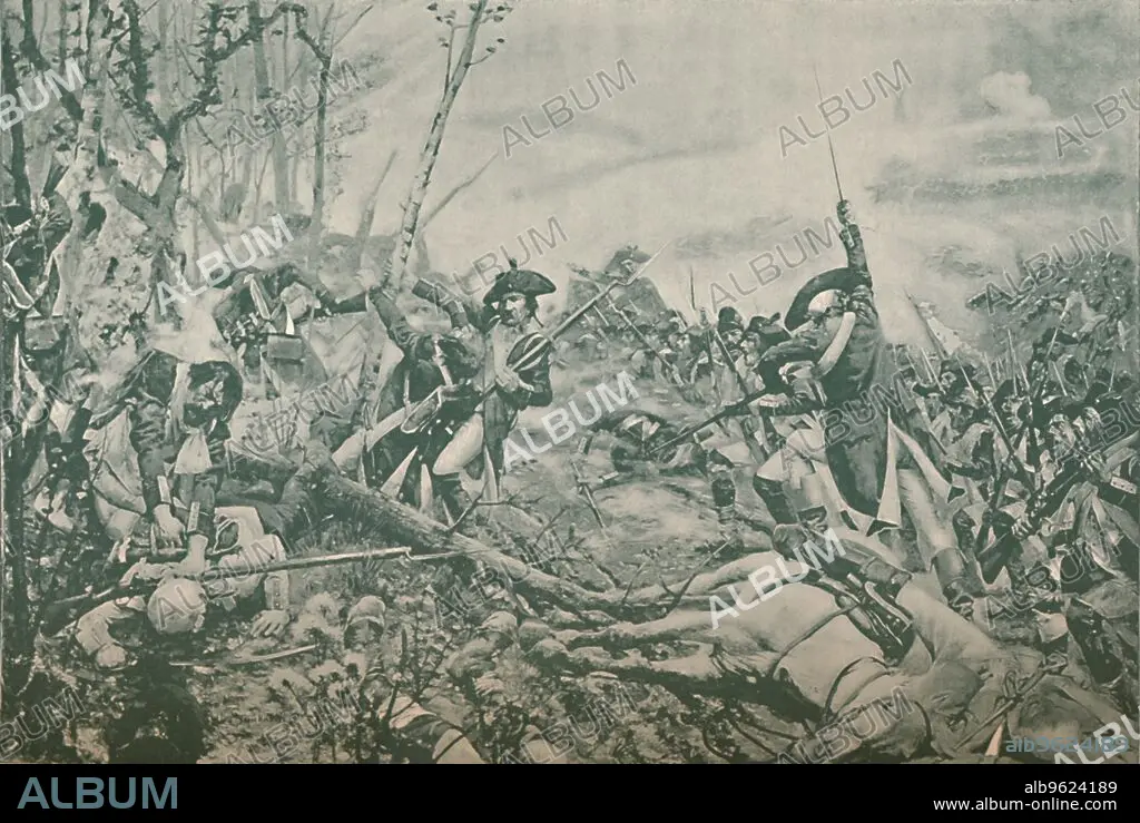 Caption: 'The Battle of Jemmapes, Near Mons, Belgium, November 6, 1792', (1896). 'The crowning incident of the battle was the taking of a redoubt by Dampiere, who led parts of broken batallions that charged singing the Marseillaise'. Engraving after the painting by Jean Paul Sinibaldi. From Life of Napoleon Bonaparte, Volume I, by William Milligan Sloane. [The Century Co., New York, 1896]