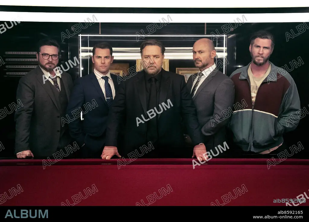 ADEN YOUNG, DANIEL MACPHERSON, LIAM HEMSWORTH, RUSSELL CROWE and STEVE BASTONI in POKER FACE, 2022, directed by RUSSELL CROWE. Copyright Arclight Films.