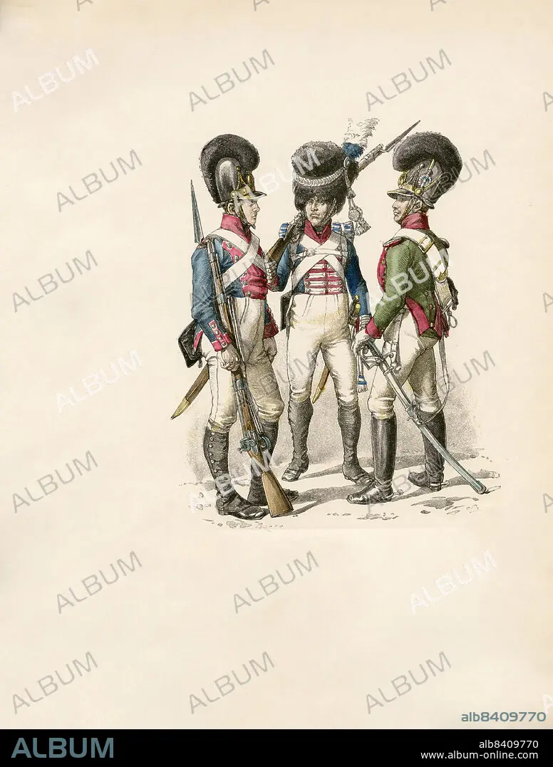 Caption: Bavarian Army, Infantryman 1814-1825, Grenadier of the Guard 1812-1815, Light Cavalryman 1805-1812, Illustration, The History of Costume, Braun & Schneider, Munich, Germany, 1861-1880