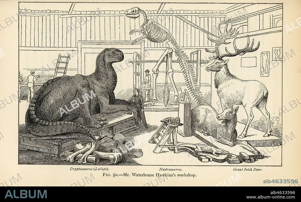 Benjamin Waterhouse Hawkins workshop of dinosaur models. Reconstructions of a Dryptosaurus aquilunguis, Hadrosaurus foulkii and Great Irish Deer, Megaloceros giganteus. Engraving after an illustration by Joseph Smit from Henry Neville Hutchinsons Creatures of Other Days, Popular Studies in Palaeontology, Chapman and Hall, London, 1896.