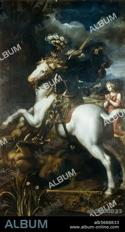 Caption: Dossi, Dosso, origin. Giovanni di Luteri, c. 1489 - c. 1542, and Dossi, Battista, origin. Battista di Luteri, c. 1493/95 - 1548. "St. George", c. 1540. Oil on canvas, 206 × 121cm. Dresden, Gemäldegalerie, Alte Meister.