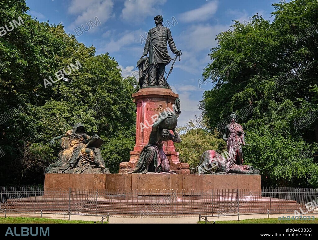 Caption: Germany, Berlin, 20. 07. 2020, Otto von Bismarck monument smeared with paint, lettering "Decolonize Berlin" (Berlin dekolonialisieren), Bündnis "Decolonize Berlin e. V, Großer Stern, Europe