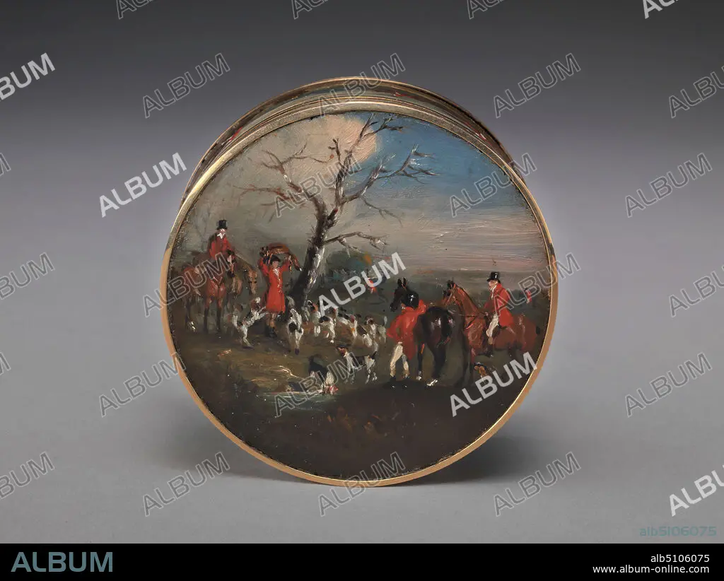 Caption: Lord Edward Thynnes Snuff Box, Decorated with Foxhunting Scenes by John Ferneley, Attributed to John Ferneley, 17821860, British, 1832 or 1833, Oil on gold, Sheet: 1 1/2 x 3 3/8 inches (3.8 x 8.6 cm), fox (animal), horse (animal), hunt, sporting art