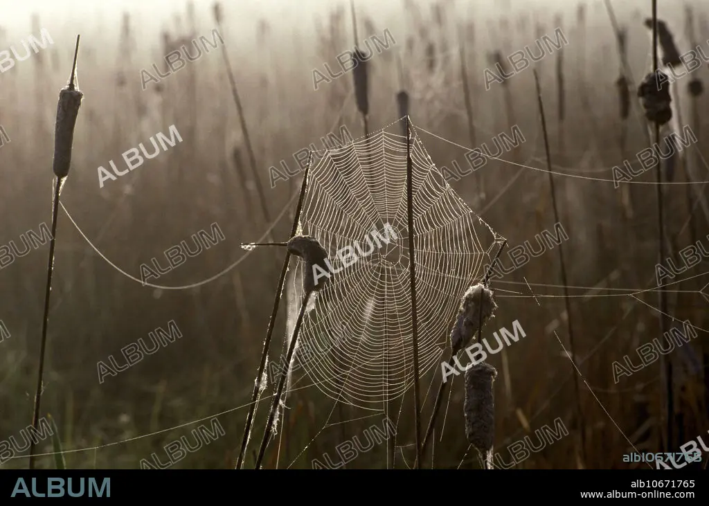 Caption: Dewy orb spider web on cattails in the early morning.