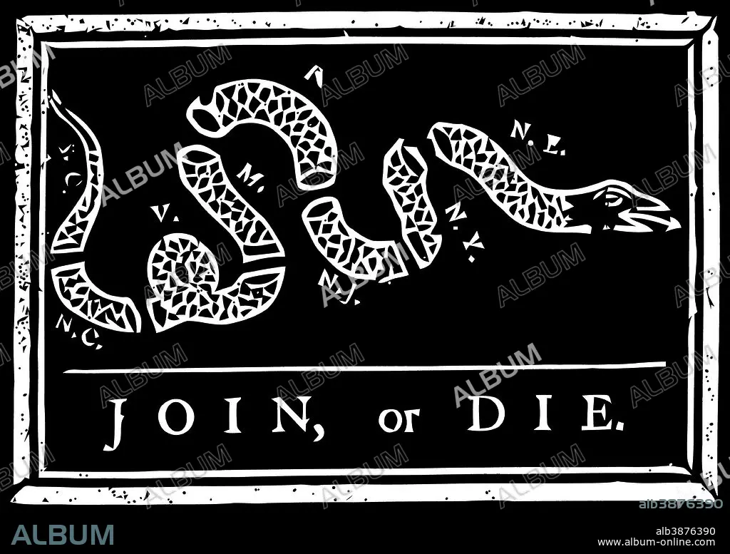 The Join or Die print was a political cartoon created by Benjamin Franklin. The snake shown is separated into segments, just as the original colonies were split. The cartoon was used to unite the colonies to fight against the British.