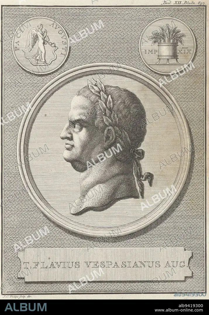 Caption: Portrait of Emperor Vespasian, Jan Caspar Philips, 1746, Medal with the portrait of Titus Flavius Vespasian, Roman Emperor. In the upper corners Roman coins., print maker: Jan Caspar Philips, (mentioned on object), Jan Caspar Philips, (mentioned on object), Amsterdam, 1746, paper, engraving, h 185 mm × w 133 mm