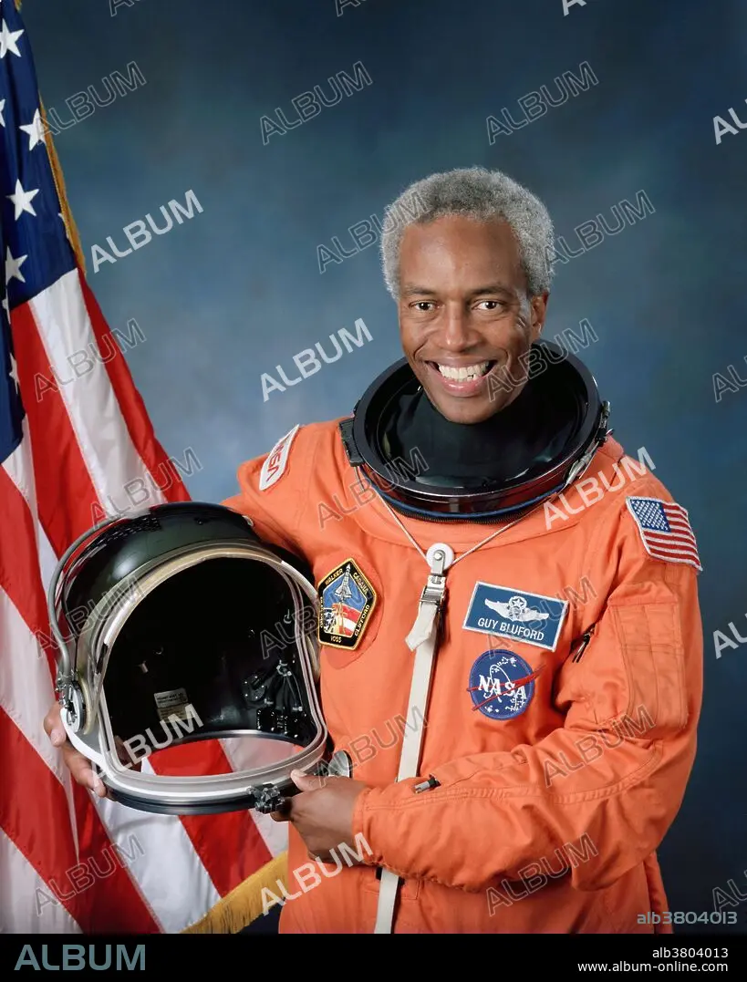 Entitled: "Official portrait of astronaut Guion S. Bluford." Guion Stewart "Guy" Bluford, Jr. (born November 22, 1942) is an engineer, and retired NASA astronaut. He attended pilot training at Williams Air Force Base, and received his pilot wings in 1966. He was assigned to the 557th Tactical Fighter Squadron, Cam Ranh Bay, Vietnam where he flew 144 combat missions. In 1972, he entered the Air Force Institute of Technology residency school at Wright-Patterson Air Force Base. Upon graduating in 1974 with his master's degree, he was assigned to the Air Force Flight Dynamics Laboratory, as a staff development engineer. He was chosen to become a NASA astronaut in 1979. He was a mission specialist on STS-8, STS-61-A, STS-39, and STS-53. In 1983, as a member of the crew of the Challenger on the mission STS-8, Bluford became the first African-American in space. He left NASA in 1993. Bluford was inducted into the International Space Hall of Fame in 1997. In 2002, scholar Molefi Kete Asante listed him on his list of 100 Greatest African- Americans. He was inducted into the US Astronaut Hall of Fame in 2010.