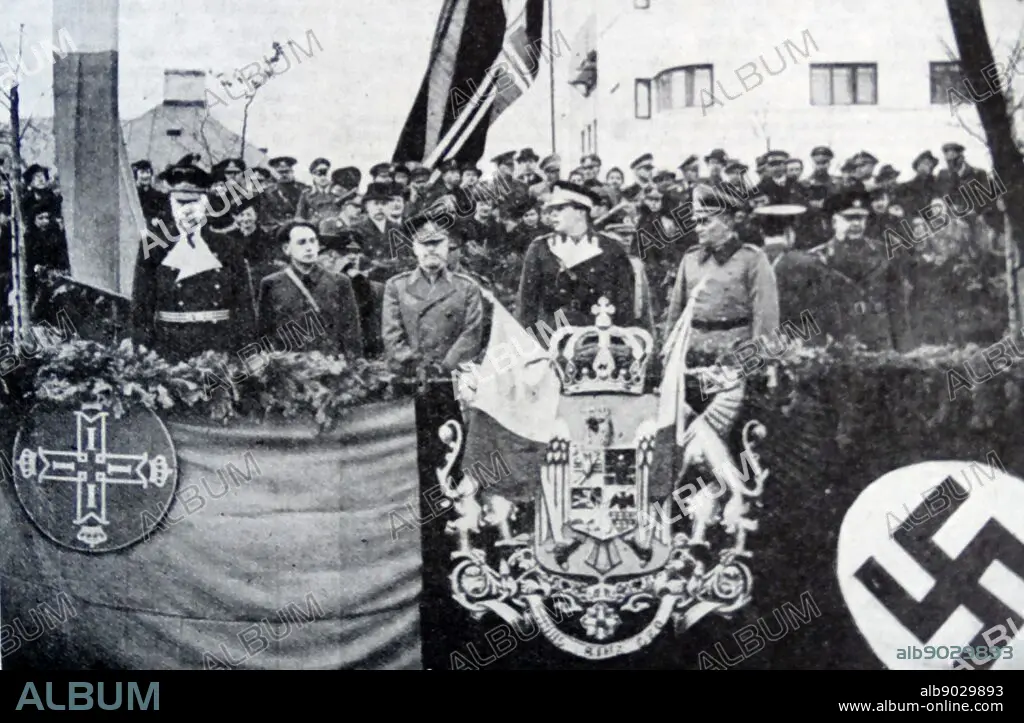 Caption: Photograph of Nazi leaders. Left to right: Fabricius, German Minister in Bucharest; Horia Sima; Marshal Antonescu; King Michael; General Hansen. Dated 1940