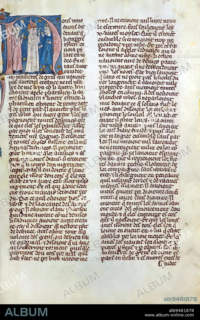 Caption: William of Tyre's Histoire d'Outre Mer, Initial 'N' with the Pharisees and Sadducees debating, This manuscript, completed in the later part of the thirteenth century, contains William of Tyre's Estoire d'Eracles (to 1229), Les Faits des Romains (continuation, Tiberius to Julian), and a letter of Prester John. While the origin of the manuscript is debatable between Acre and Paris, Jaroslav Folda suggests a strong connection with Epinal 45, a manuscript known to have been created in Paris during this same time. Versions of William of Tyre's work were particularly popular in France during the latter part of the thirteenth century.