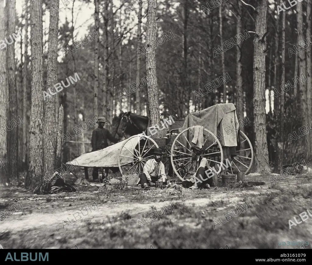 Caption: Petersburg, Virginia: 1864 Civil War photographer Mathew Brady seated, left, with his wagon and equipment used to photograph scenes on the battlefield