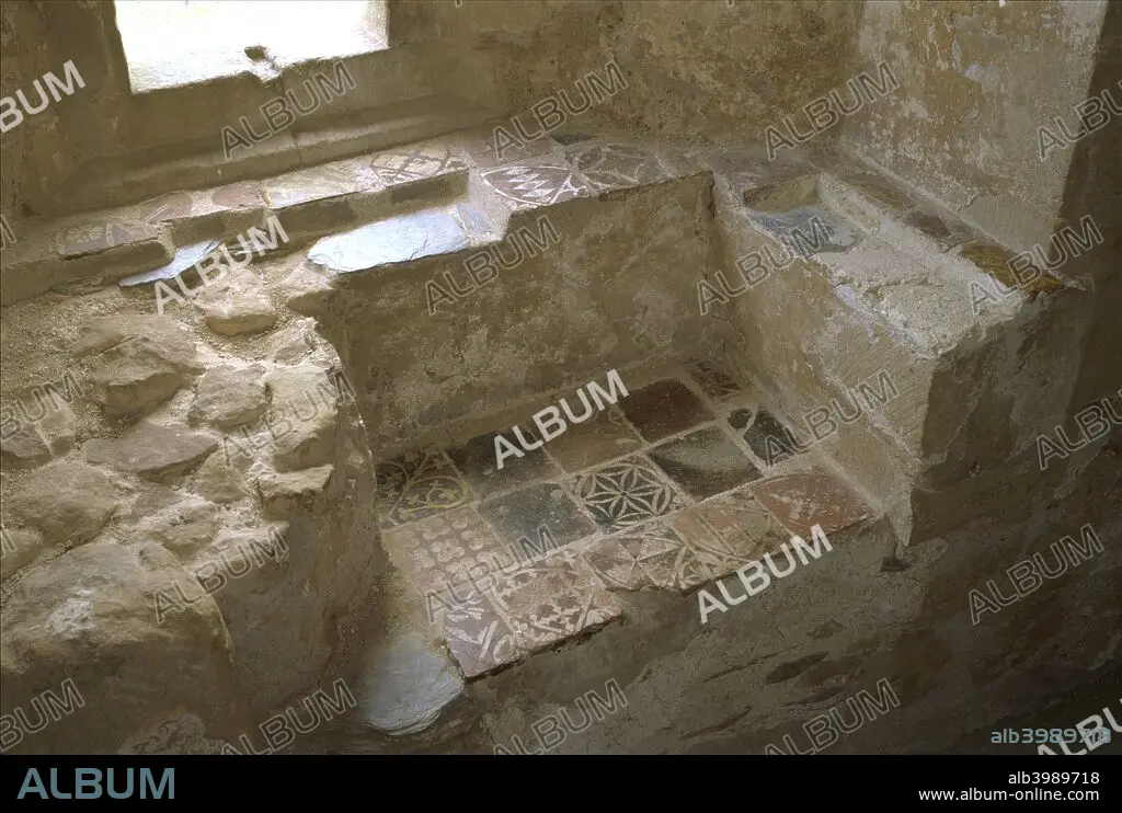 Caption: Window seat at Cleeve Abbey, Somerset, 1999. Cleeve Abbey was founded as a Cistercian monastery in 1198 and many of the surviving buildings date from the 13th century. The dormitory at Cleeve is one of the best examples in England. It contained a number of tiled window seats.