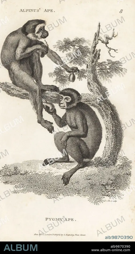 Caption: Barbary macaques, endangered, Macaca sylvanus. As Alpinus' Ape and Pygmy ape, Simia sylvanus. After illustrations by Prosper Alpinus and one sent by Peter Collinson to the Comte de Buffon. Copperplate engraving by James Heath from George Shaws General Zoology: Mammalia, G. Kearsley, Fleet Street, London, 1800.