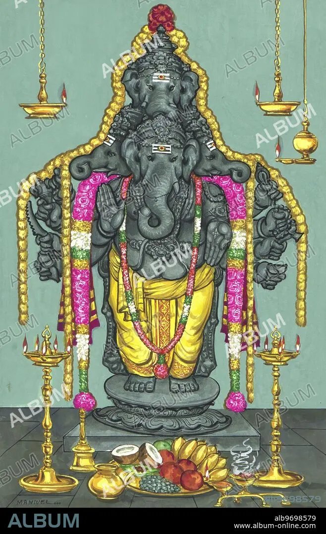 Caption: HAP-136826 : Ganeshas - Hindu belief - Hindu - Hinduism - art - Artist Manivelu - Himalayan Academy art - Ganesh - Pancha ganapati - lamp - shrine - garland - clothes - murti - incense - fruits - prasadam - festival - Ganesha - God - Lord of Obstacles - India - Indian art - Hindu art - religion - Hindu religion
