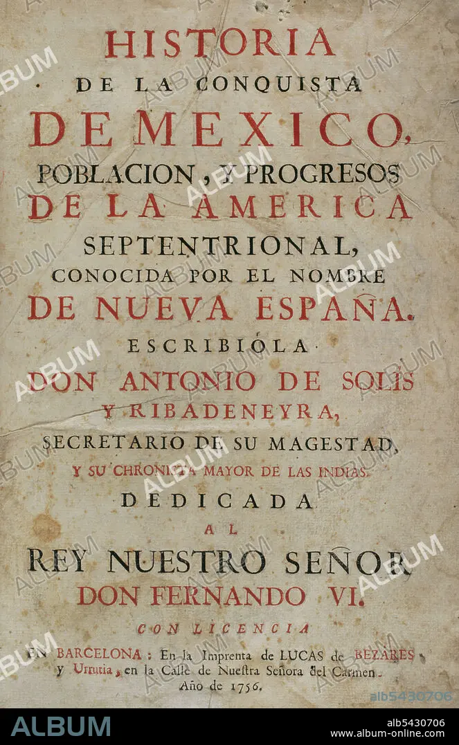 Caption: "Historia de la Conquista de México, población, y progresos de la América septentrional, conocida por el nombre de Nueva España" (History of the Conquest of Mexico, population, and progress of northern America, known by the name of New Spain). Written by Antonio de Solís y Rivadeneryra (1610-1686), Chronicler of the Indies. Edition published in Barcelona, 1756. Printing house of Lucas de Bezares y Urrutia. Historical Military Library of Barcelona. Catalonia, Spain.