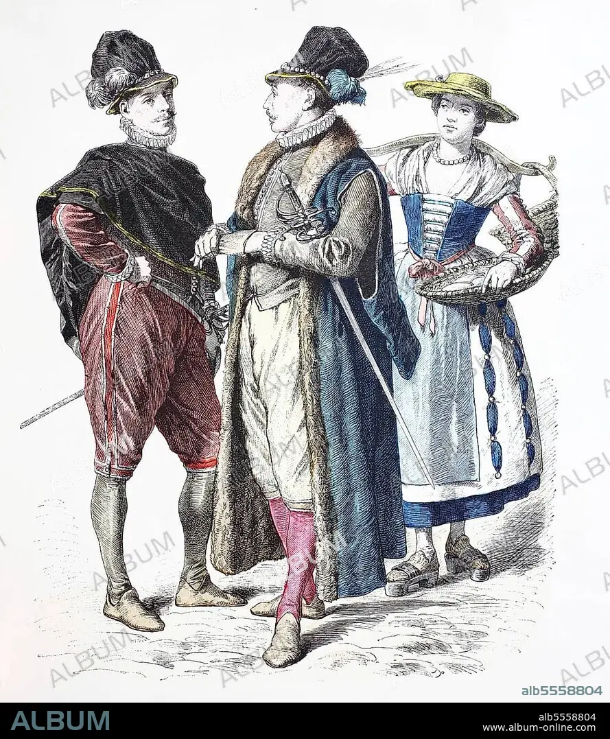 Folk traditional costume, clothing, history of costumes, persons from Venice, Milan and Florent, Italy, 1570-1600, digitally restored reproduction of a 19th century original, exact date unknown, Europe.