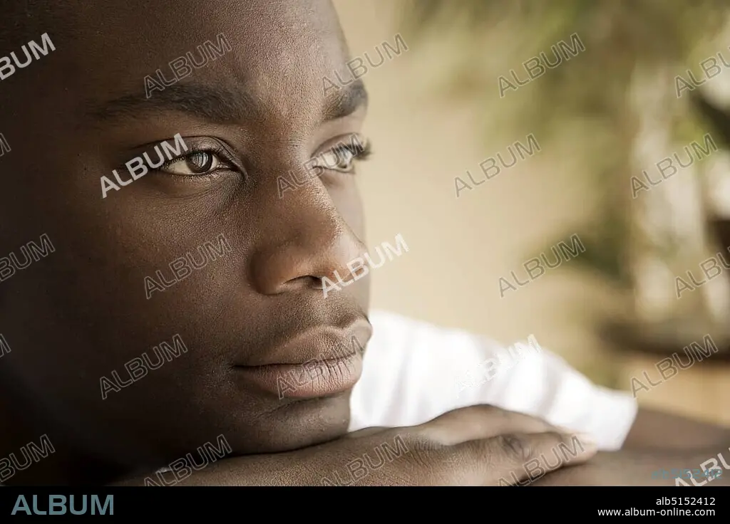 Dark-skinned, 15-year-old boy, faraway look in eyes.
