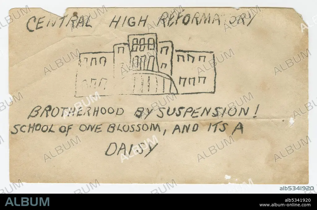 Small mimeographed flyer owned by African-American civil rights activist Daisy Bates who led the NAACP (National Association for the Advancement of Colored People) branch in Arkansas and was in charge of the Little Rock school integration. Bates worked to organize a safe integration process and mentored the first students, known as the Little Rock Nine. Due to intense protests, President Dwight D. Eisenhower sent the Arkansas National Guard to ensure that the school integration could proceed. Protestors and advertisers boycotted the Arkansas State Press, an activist newspaper owned by Daisy and her husband Lucius Christopher Bates. The Bates suffered financial difficulties due to their outspoken integration efforts. Black ink on soiled white paper. It features a drawing of Little Rock Central High School and the text [CENTRAL HIGH REFORMATORY / BROTHERHOOD BY SUSPENSION! / SCHOOL OF ONE BLOSSOM, AND IT’S A / DAISY] Discolored throughout. Edge wear throughout, with tears and loss. Two small holes at bottom right.