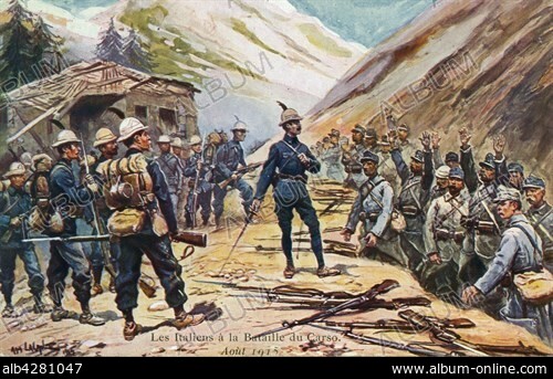 Caption: Postcard representing Italian troops (left) triumphing over the Austro-Hungarian army during the Second Battle of the Isonzo.. Illustration by Alphonse Lalauze.. August 3, 1915