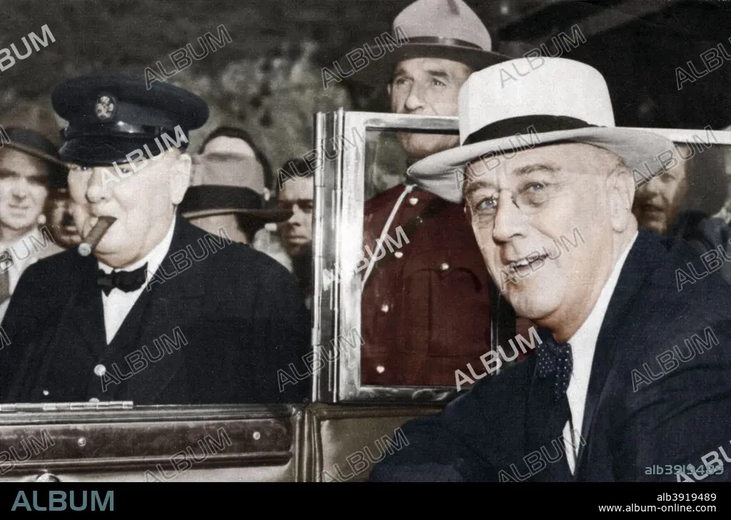 Caption: Franklin Delano Roosevelt (1882-1945), 32nd President of the USA (right) and Winston Churchill (1874-1965), British Prime Minister, meeting in Quebec in 1944. Churchill is smoking one of his trademark cigars. Churchill and Roosevelt had frequent summit meetings during the war to discuss strategy, usually at Churchill's instigation. After the successful D-Day landings in Normandy in June 1944, the two leaders met in Quebec to agree their policy on the treatment of Germany after the war. (Colorised black and white print).