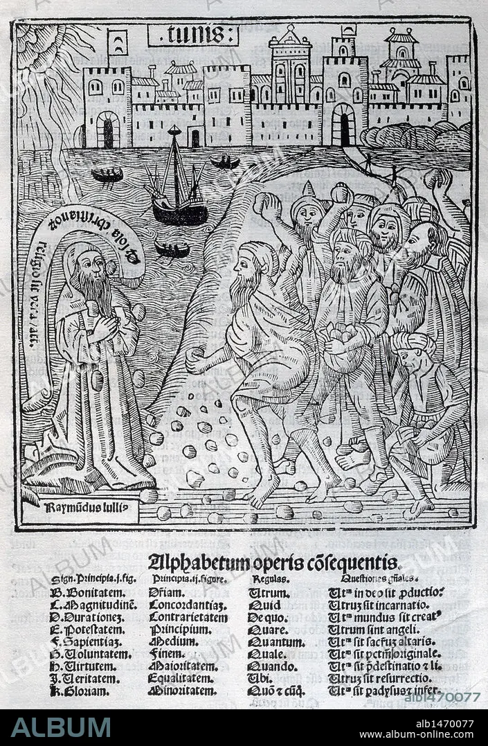LITERATURA CATALANA. SIGLOS XIII-XIV. LLULL, Ramon (Palma de Mallorca, 1233 ó 1235Bujía, 1315 ó 1316). Filósofo, místico y literato mallorquín. Grabado de la "LAPIDACION DE RAMON LLULL". "Raymudus lullis. Alphabetum operis cosequentis" Edición impresa en Valencia por D. de Gumiel en el año 1515.