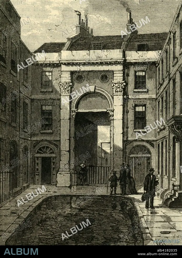 Caption: 'Essex Water Gate, Essex Street, Strand', (1881). 'Triumphal' gateway built c1676 by Nicholas Barbon to screen his commercial development in the fashionable Strand area of London, from the wharf on the River Thames below. A giant order of fluted Corinthian pilasters on pedestals supports an archivolt arch. From Old and New London: A Narrative of Its History, Its People, and Its Places. Westminster and the Western Suburbs, by Edward Walford, Vol. III. [Cassell, Petter, Galpin & Co., London, Paris & New York, 1881]