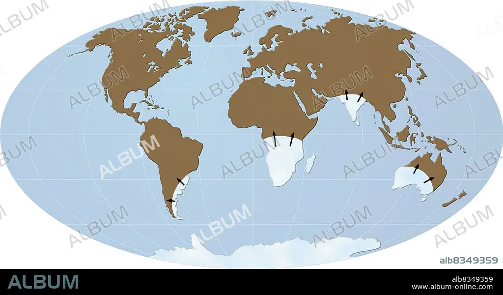Caption: The theory of continental drift is the presence of glacial deposits in the southern regions of some continents. Traces of glaciation can be found in South America, Australia, and even Africa and India, zones that are now decidedly tropical. These glacial deposits, which indicate that ice flowed toward the interior of continents, were probably left by the Antarctic icecap.