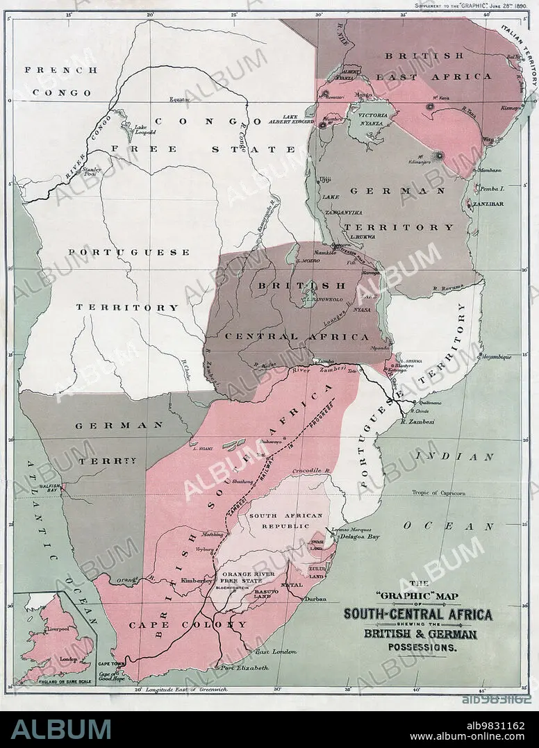 Caption: Map of south-Central Africa showing British and German possessions in the 1890s. After a map published in the June 25th, 1890 edition of The Graphic. The inset map, lower left, shows England on the same scale as the African map.