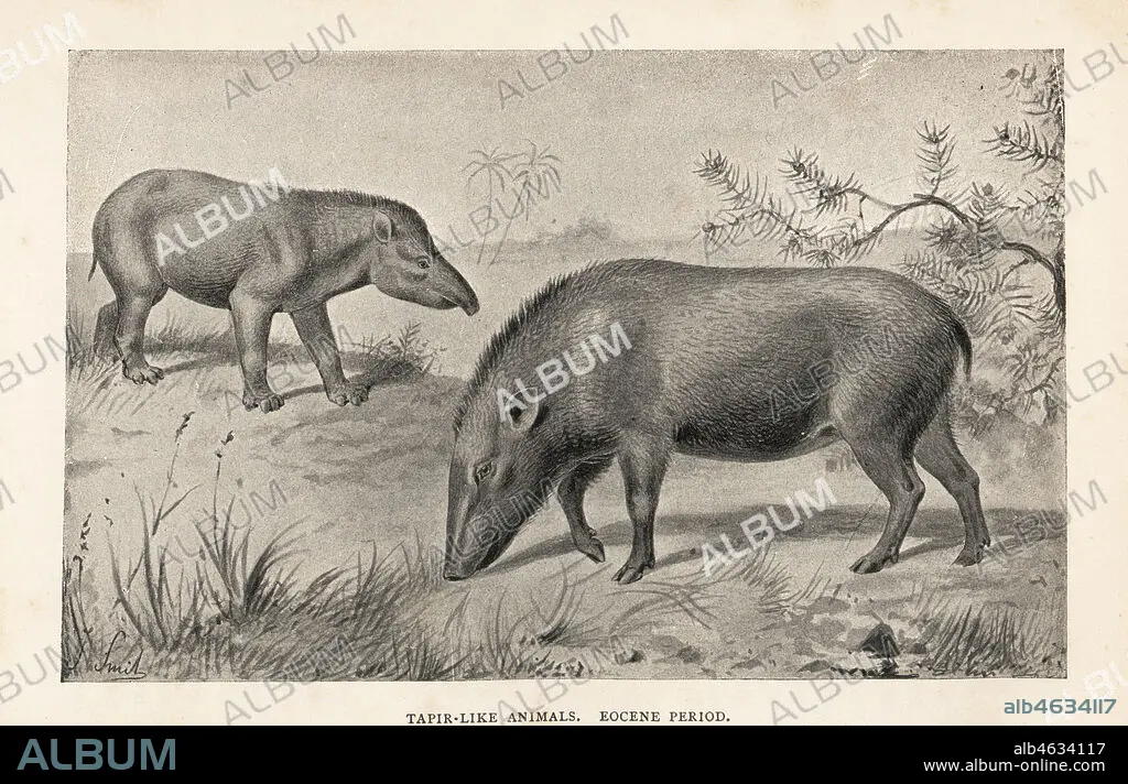 Caption: Palaeosyops and Anthracotherium. Tapir-like animals, Eocene Period. Print after an illustration by Joseph Smit from Henry Neville Hutchinsons Creatures of Other Days, Popular Studies in Palaeontology, Chapman and Hall, London, 1896.