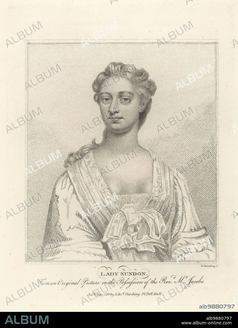 Charlotte Clayton, Baroness Sundon, c.1679-1742. British lady in waiting, bedchamber woman and influential favourite of queen regent Caroline. Wife of William Clayton, 1st Baron Sundon of Ardagh. Lady Sundon. Copperplate engraving by Edward Harding from John Adolphus The British Cabinet, containing Portraits of Illustrious Personages, printed by T. Bensley for E. Harding, 98 Pall Mall, London, 1800.