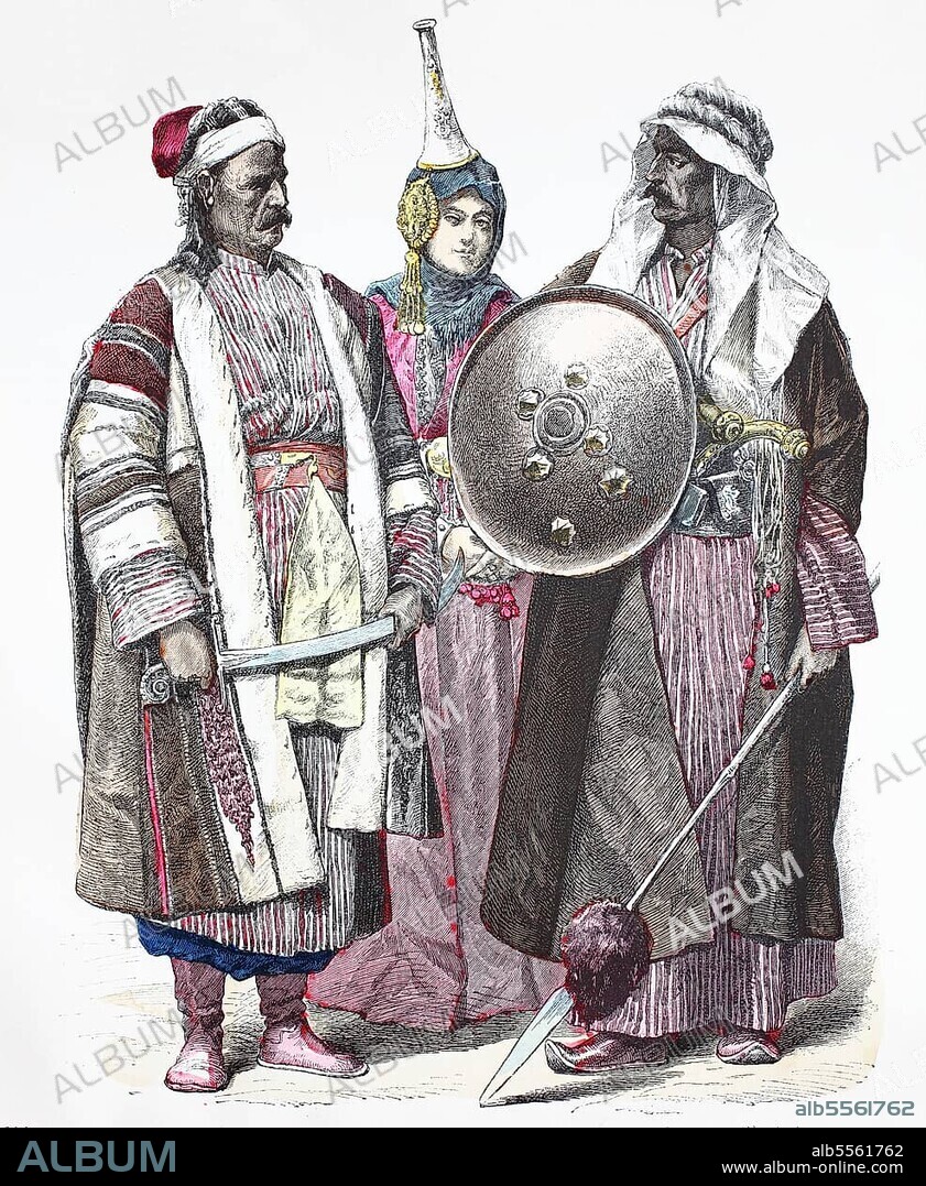 Folk traditional costume, clothing, history of costumes, Balka from Syria, woman from Damaskue, Arab from Baghdad, 1885, digitally restored reproduction of a 19th century original, exact date unknown.
