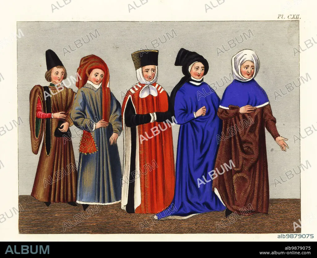 Caption: Costumes of state officers of the 15th century. They wear headdresses with drapery, rich velvet mantles and robes with slit sleeves. Taken from the manuscript of Jean Froissart's Chronicles, 1470-72, Harley MS 4379. Handcoloured engraving by Joseph Strutt from his Complete View of the Dress and Habits of the People of England, Henry Bohn, London, 1842.