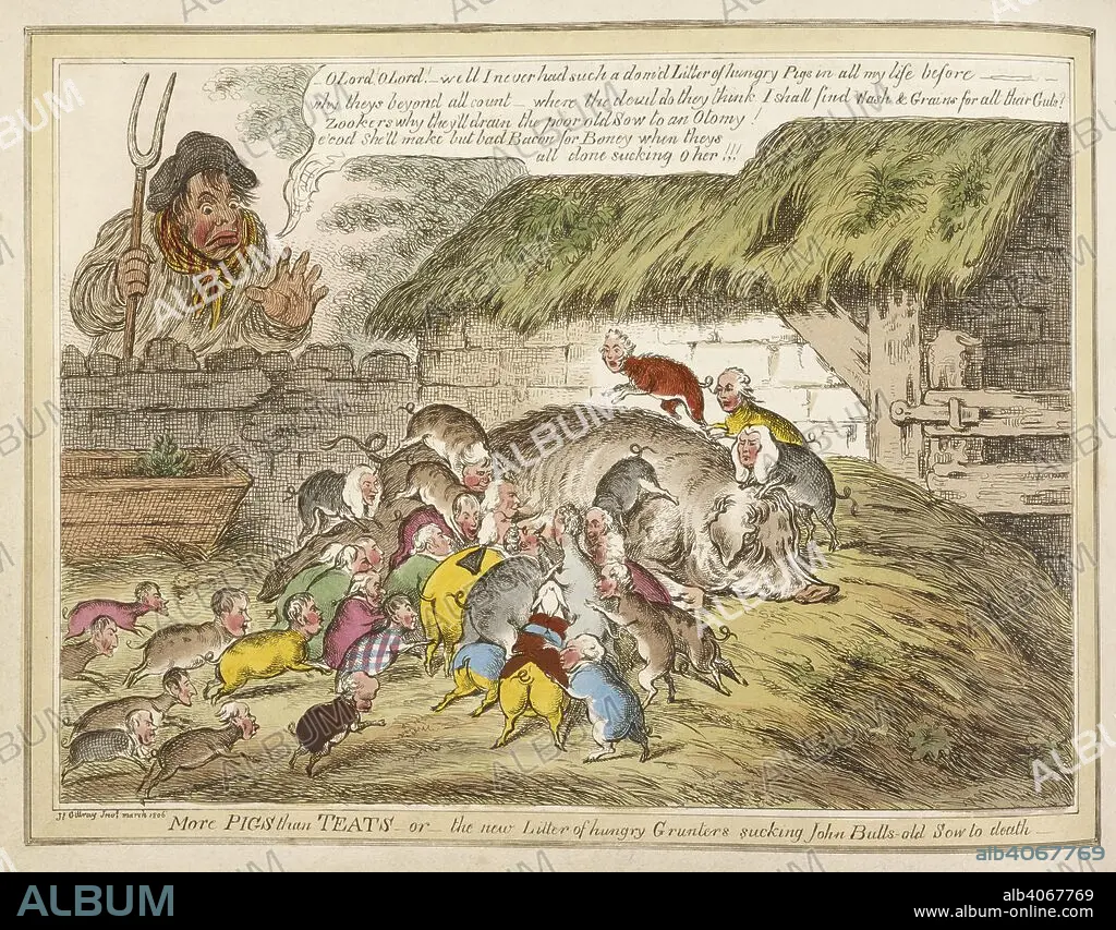 'More pigs than treats - or - the new litter of hungry grunters sucking John Bulls - old sow to death. . The caricatures of Gillray; with historical and political illustrations, biographical anecdotes and notices. pt. I-IX. London, 1818. Source: 745.a.6 opposite page 49.