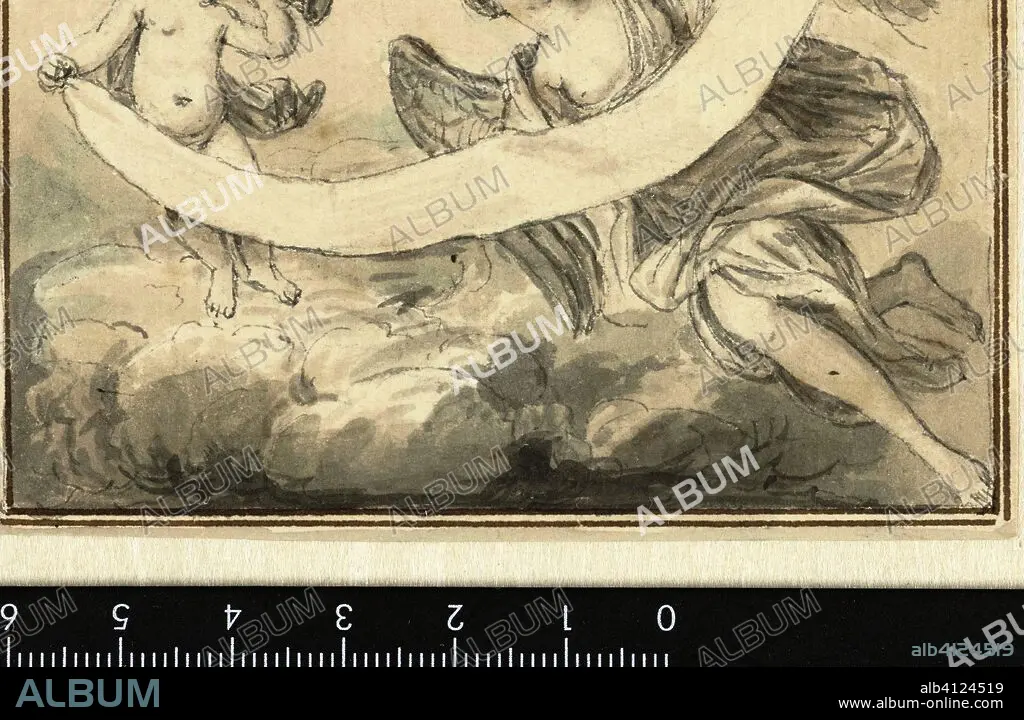 Caption: Design for vignette with floating Fame and angel with banderole. Draughtsman: Louis Fabritius Dubourg. Dating: c. 1703 - c. 1775. Measurements: h 61 mm × w 93 mm.