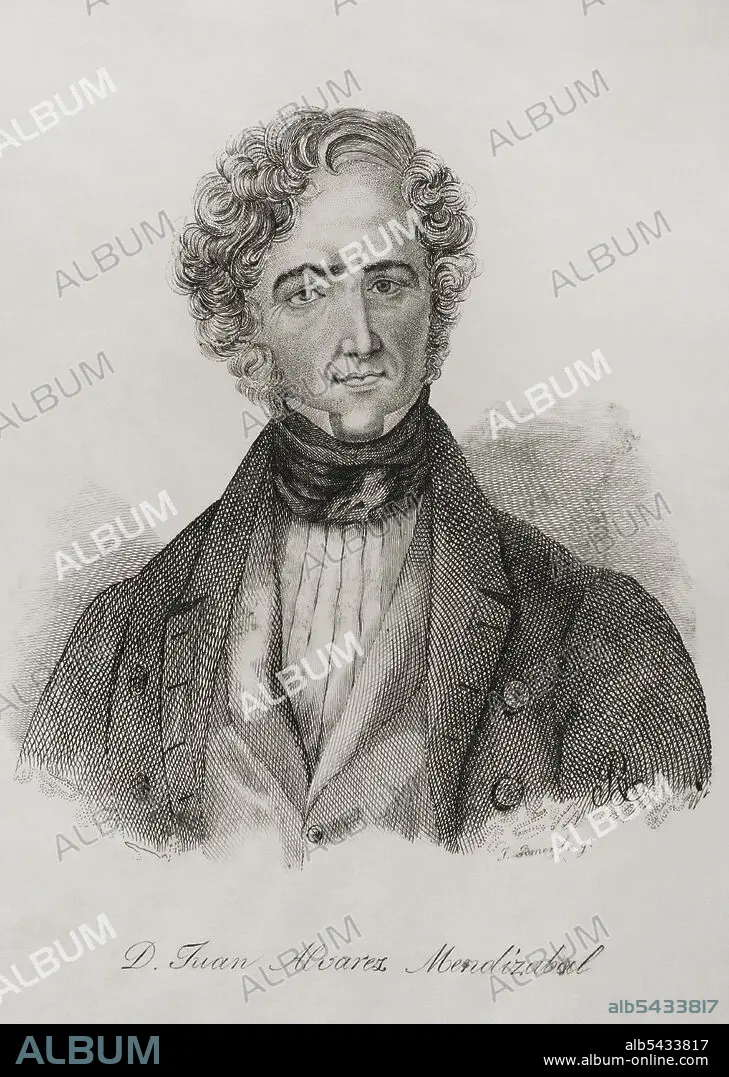 Caption: Juan Alvarez de Mendizábal (1790-1853). Spanish politician and financier who had great importance in the Spanish liberal Revolution. He was appointed Minister of Finance in July 1835 by the Count of Toreno, from which he promoted the confiscation of the confiscation of Catholic Church's properties. Portrait. Engraving by José Gómez. Panorama Español, Crónica Contemporánea. Volume III. Madrid, 1845.