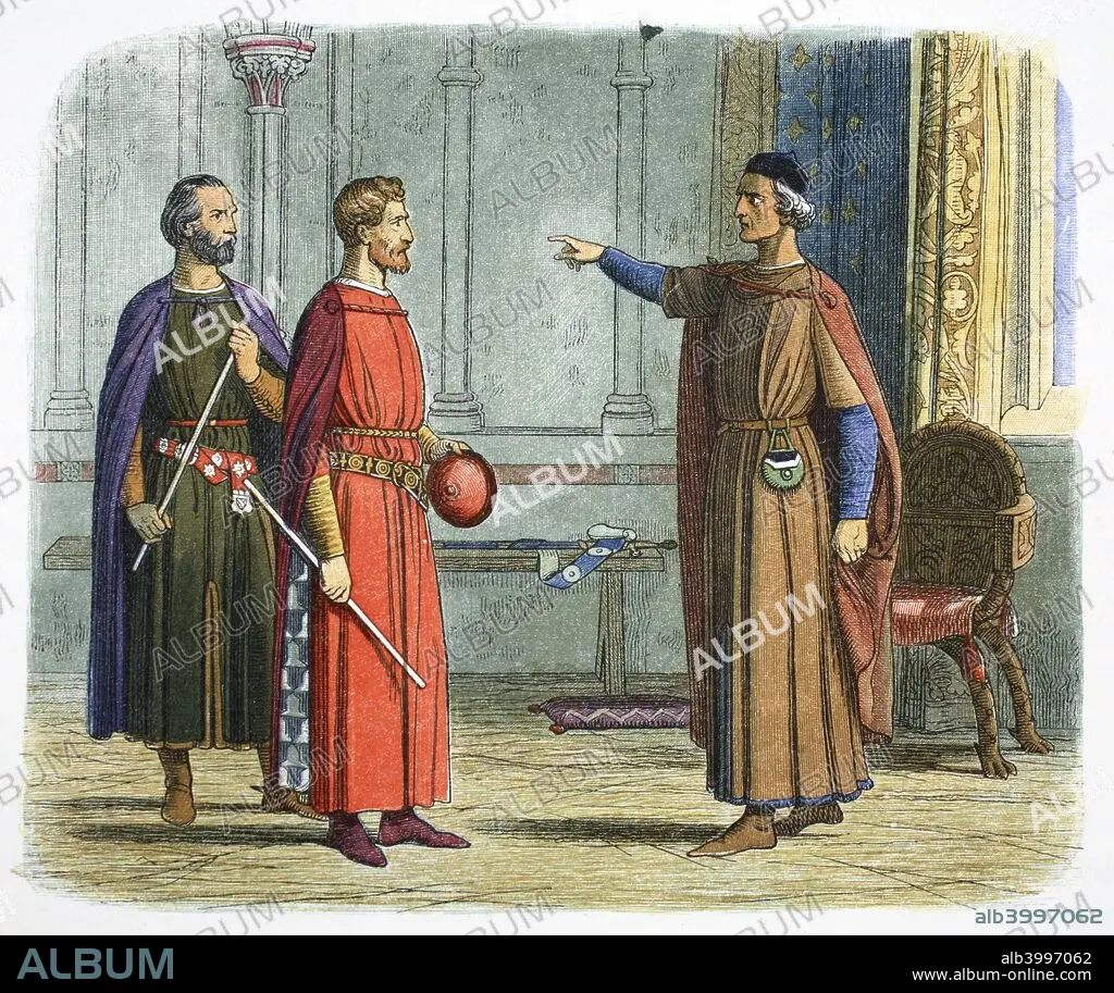 Caption: King Edward I threatens the Lord Marshal, 1297 (1864). Humphrey de Bohun (1276-1322), Earl of Hereford, Lord High Constable, and Roger Bigod (1245-1306), Earl of Norfolk, Lord Marshal of England, confront Edward I (1239-1305). They had drawn up a series of complaints known as the Remonstrances, objecting to Edward's right to demand military service and the levels of taxation he was imposing. The confrontation threatened to plunge the kingdom into civil war, but both sides reunited against the threat from Scotland after the king's army was defeated by William Wallace at the Battle of Stirling Bridge.