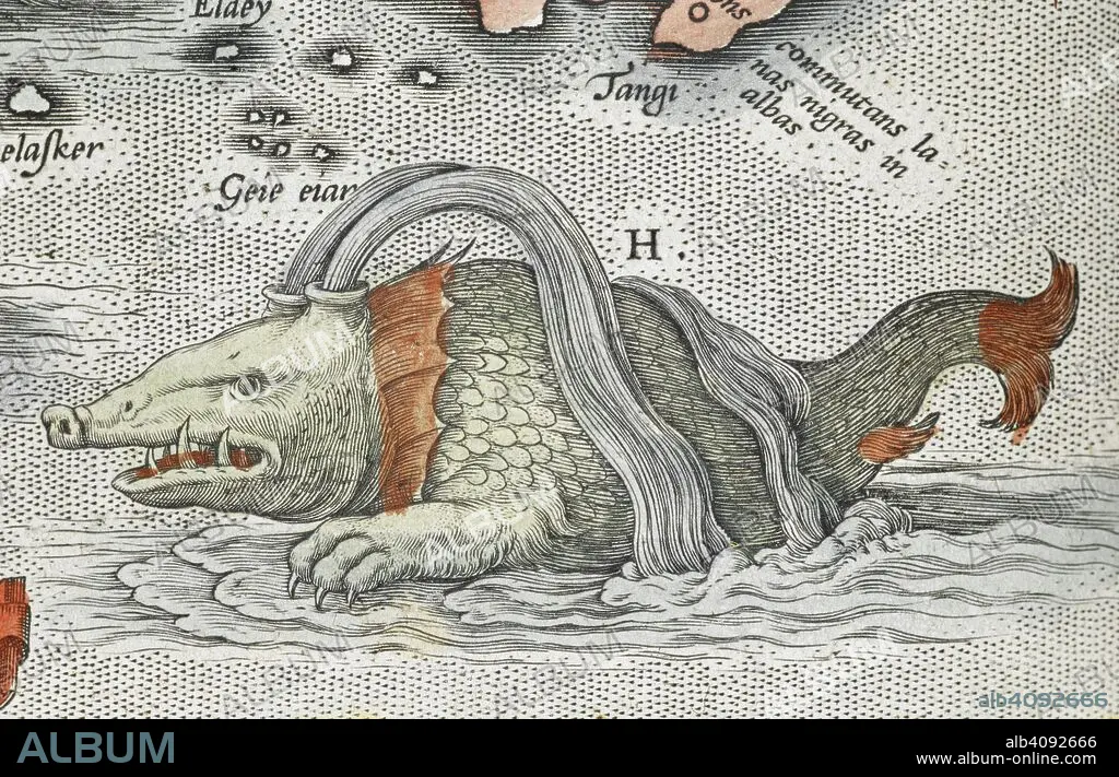 ABRAHAM ORTELIUS. (Detail). A sea monster. [Typus orbis terrarum] (main title of album, containing 90 maps). Antwerp. 1598. Source: Maps C.2.d.7.(2).