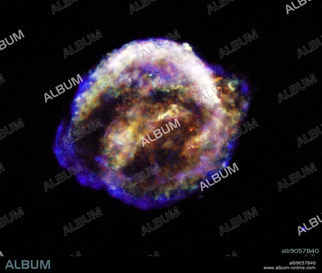 Caption: Kepler's Supernova Remnant: A View from Chandra X-Ray Observatory. Each top panel in the composite shows the entire remnant. Each colour in the composite represents a different region of the electromagnetic spectrum, from X-rays to infrared light. The X-ray and infrared data cannot be seen with the human eye. Astronomers have color-coded those data so they can be seen in these images. The bottom panels are close-up views of the remnant. In the bottom, centre image, Hubble sees fine details in the brightest, densest areas of gas. The region seen in these images is outlined in the top, centre panel.
