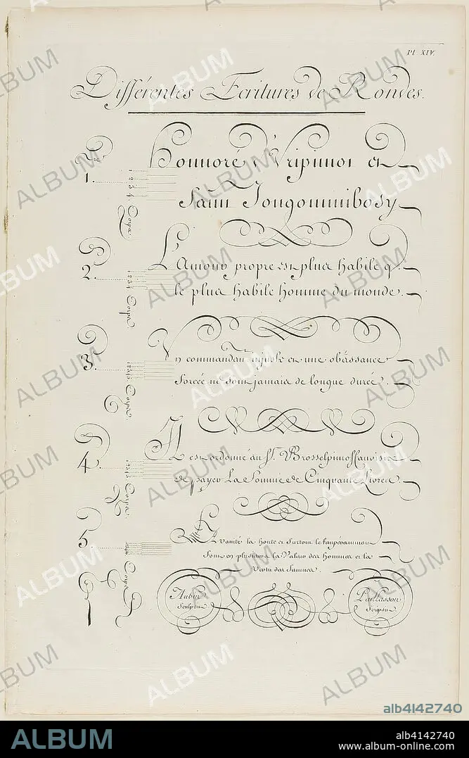 Caption: Various Rounded-Style Calligraphy, from Encyclopédie. Aubin (French, active 18th century); after Charles Paillasson (French, 1718-1789); published by André le Breton (French, 1708-1779), Michel-Antoine David (French, c. 1707-1769), Laurent Durand (French, 1712-1763), and Antoine-Claude Briasson (French, 1700-1775). Date: 1760. Dimensions: 400 × 260 mm. Engraving on cream laid paper. Origin: France.