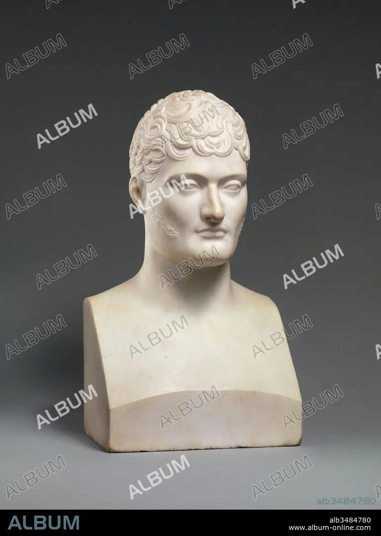 Jérôme Bonaparte (1784–1860), 1810–13, French, Carrara marble, Height: 21 1/2 in. (54.6 cm), Sculpture, After an original by Baron François Joseph Bosio (French, 1768–1845), This portrait of Napoleon's brother, designated king of Westphalia, is one of a number of busts copied from the head of a statue of Jérôme that was carved by the imperial court sculptor.