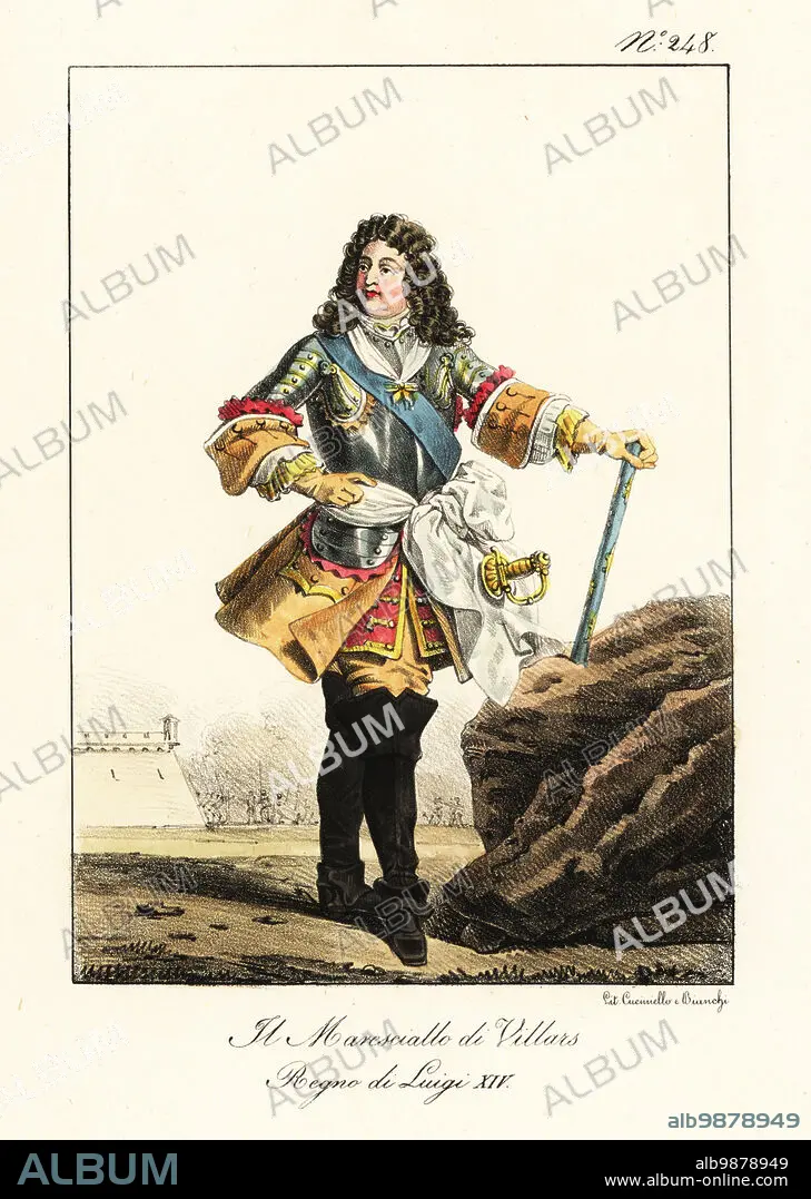 Caption: Claude Louis Hector de Villars, Prince de Martigues, Duc de Villars, Vicomte de Melun, 1653-1734, French military commander to King Louis XIV of France. In buff coat, red jacket with frogging, breastplate, ribbon with Order of the Golden Fleece, sword and baton. Le Marechal de Villars. Regne de Louis XIV. Handcoloured lithograph by Lorenzo Bianchi and Domenico Cuciniello after Hippolyte Lecomte from Costumi civili e militari della monarchia francese dal 1200 al 1820, Naples, 1825. Italian edition of Lecomtes Civilian and military costumes of the French monarchy from 1200 to 1820.