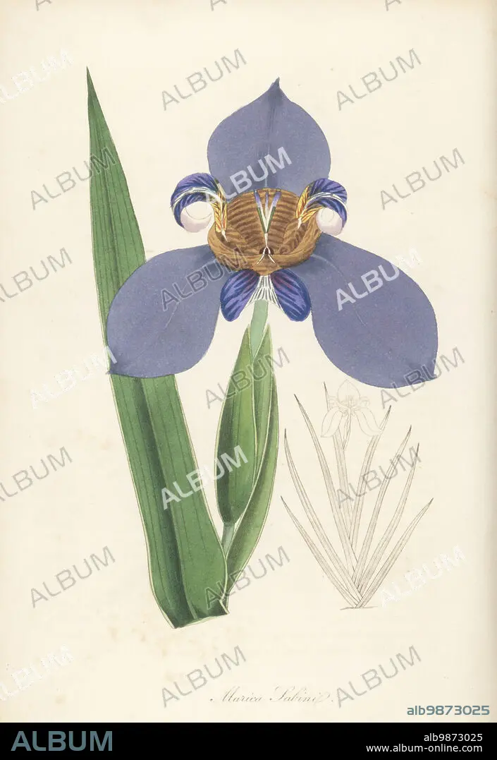 Caption: North's false flag or walking iris, Trimezia northiana. Native to Brazil, introduced to the Horticultural Society in 1822. Captain Sabine's marica, Marica sabini. Handcoloured engraving from Joseph Paxtons Magazine of Botany, and Register of Flowering Plants, Volume 1, Orr and Smith, London, 1834.