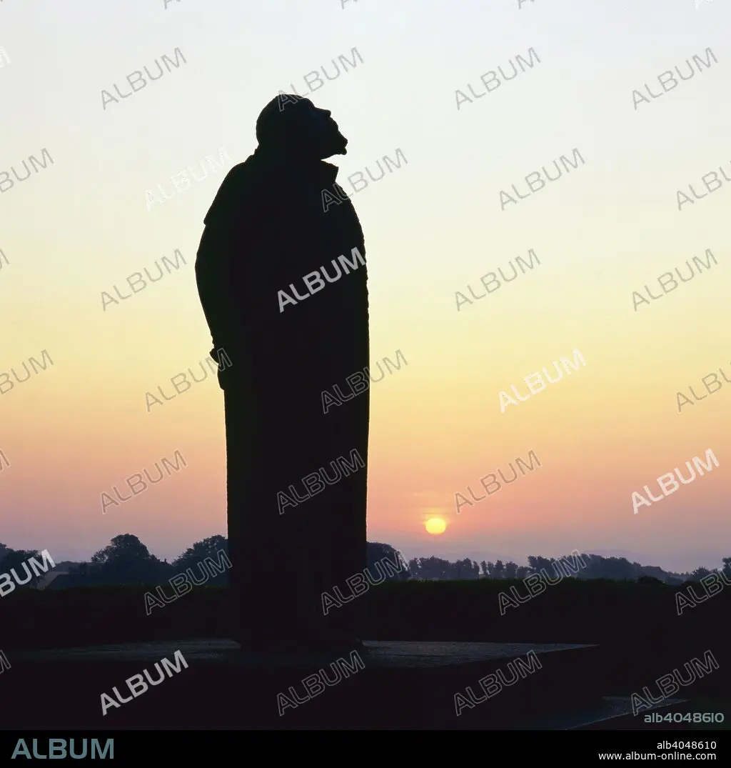 Title: Statue of Danish astronomer Tycho Brahe at sunset, Uranienborg, Ven, Sweden. Artist: Per Eliasson
