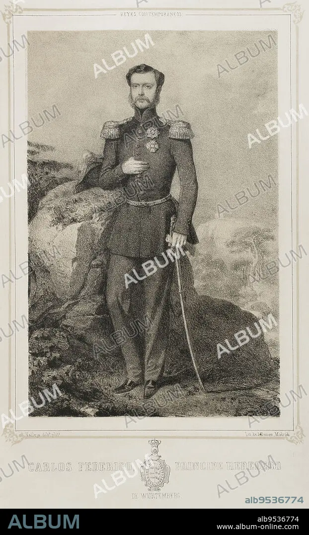 Caption: Karl I of Württemberg (1823-1891). Third King of Württemberg (1864-1891). Portrait of Karl Friedrich Alexander as Crown Prince of Württemberg. Drawing by J. Vallejo. Lithography by J. Donón. "Reyes Contemporáneos". Volume I. Published in Madrid, 1855.