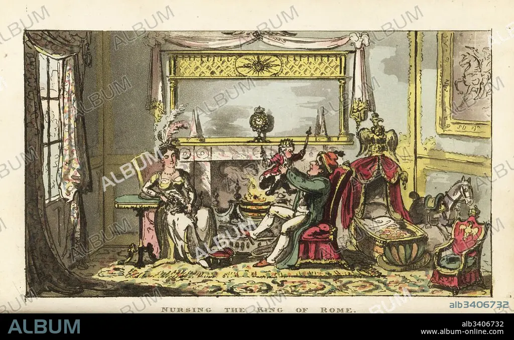 Caption: Napoleon Bonaparte and Empress Marie Louise nursing their first son Napoleon Francois Charles Joseph Bonaparte, King of Rome, 1811. Handcoloured copperplate engraving by George Cruikshank from The Life of Napoleon a Hudibrastic Poem by Doctor Syntax, T. Tegg, London, 1815.