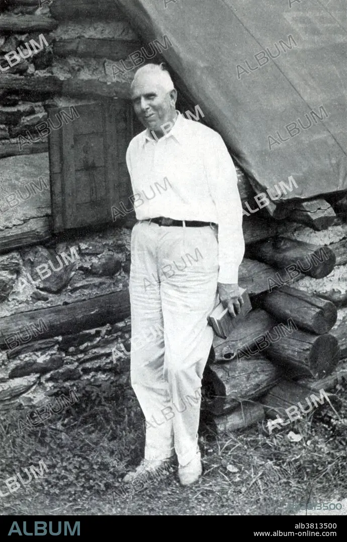 Caption: Dreiser on his summer estate. Theodore Herman Albert Dreiser (August 27, 1871 - December 28, 1945) was an American novelist and journalist. He published his first novel, Sister Carrie, in 1900. It sold poorly and was considered controversial because it features a country girl who pursues her dreams of fame and fortune through relationships with men. The book has since acquired a considerable reputation and has been called the "greatest of all American urban novels." His first commercial success was An American Tragedy, based on details and setting of the 1906 murder of Grace Brown by Chester Gillette in upstate New York. While the novel sold well, it was also criticized for his portrayal of a man without morals who commits a sordid murder. One of his strongest champions during his lifetime, H. L. Mencken, said "He was a man of large originality, of profound feeling, and of unshakable courage. All of us who write are better off because he lived, worked, and hoped." He died in 1945 at the age of 74. No photographer credited, undated.