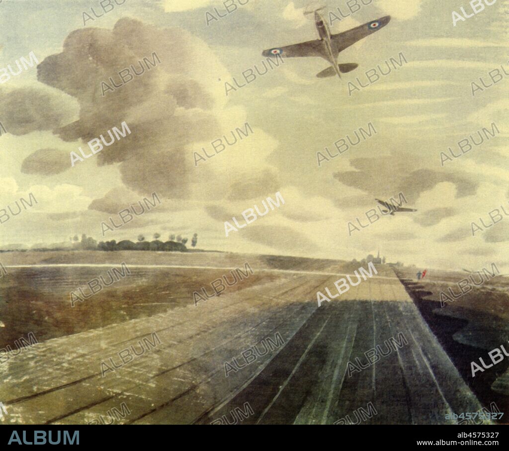 'Runway Perspective', 1941, (1944). RAF Spitfires at a British airfield during the Second World War. Painting in the Imperial War Museum, London. From "Britain In The Air", by Nigel Tangye. [Collins, London, 1944]