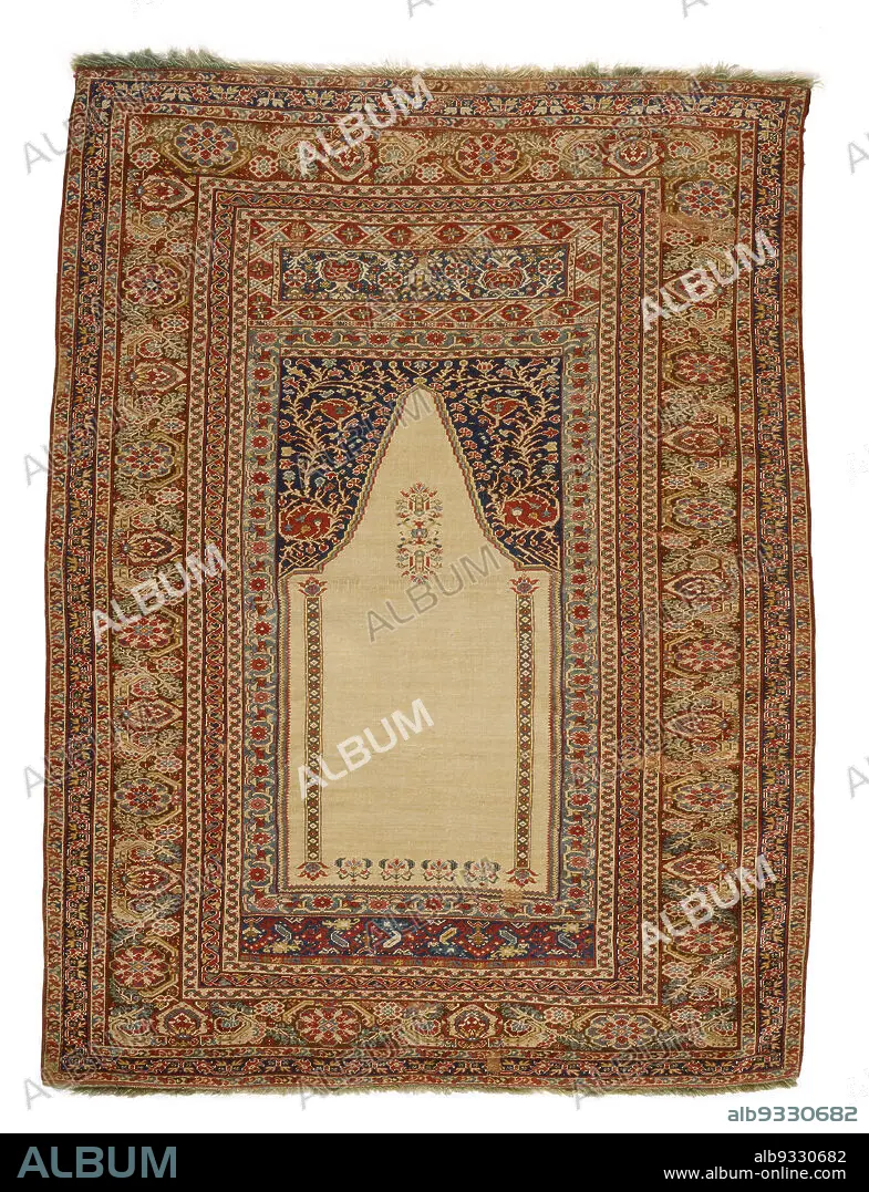 Caption: Prayer Carpet with White Ground Field, Ottoman period, 12811924, late 18thearly 19th century, Wool, Gördes, Manisa province, Anatolia, Turkey, Asia, Coverings & hangings, textiles, 61 x 54 in. (155 x 137.2 cm)