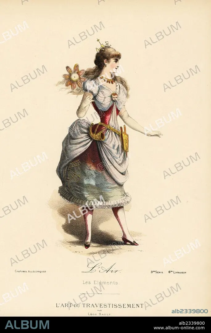 Fancy dress costume for the element Air, with dress embroidered with windmill, bodice with zephyr brooch, girdle with horn and bellows, headdress of weather vane. Handcoloured lithograph after a design by Leon Sault from "L'Art du Travestissement" (The Art of Fancy Dress), Paris, c.1880. Sault was a theatre and opera designer and luxury fashion magazine publisher.